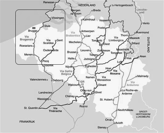 Zoals men kan zien op de onderstaande kaart (figuur 8) liepen doorheen het grondgebied van het huidige België een viertal belangrijke doorgaande pelgrimsroutes -onze regio de Via Brugensis - vanuit het Noorden (Nederland) en het Oosten (Duitsland) zuidwaarts, om dan samen te komen in Parijs en om verder zuidwaarts uit te monden in de "Via Turonensis", een van de 4 grote Noord-Zuidassen-St.-Jakobsroutes in Frankrijk richting Compostela.